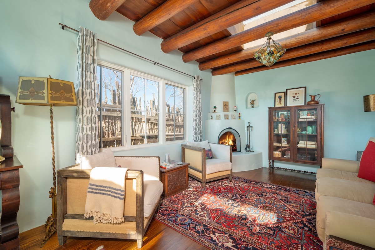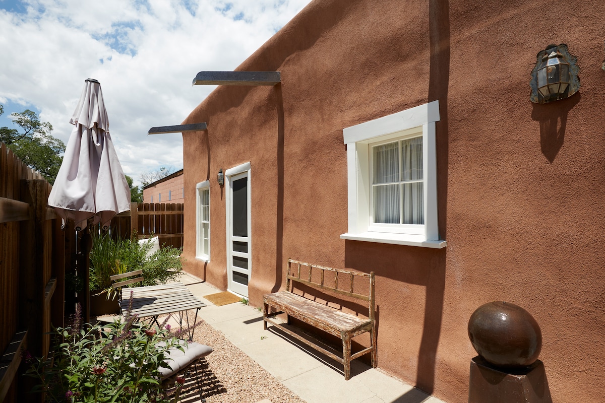 Our charming historic classic adobe casita is an easy ten minute walk to the Santa Fe Plaza, dining, and museums. We offer private off street parking for two vehicles. The interior features classic Santa Fe style wood beam Viga ceilings, kiva fireplace stocked with wood, skylights, a full kitchen living area, private bedroom, soaking tub, modern appliances, washer & dryer, swamp cooler, WIFI, flat-screen TV, a lovely enclosed courtyard with mature trees and BBQ. Dogs are welcome.