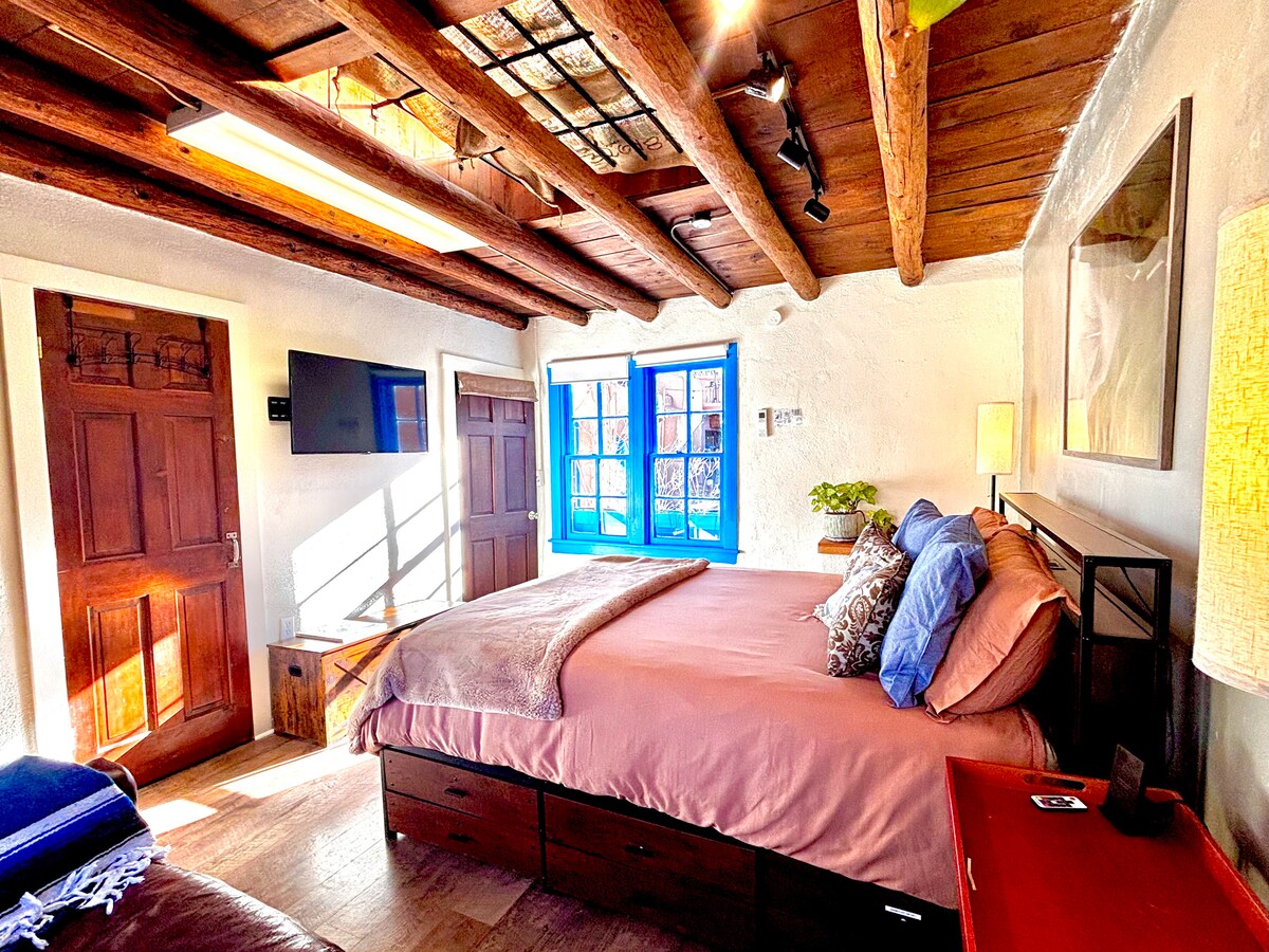 Luxe adobe casita, situated in downtown Santa Fe, just blocks away from the Plaza! This historic structure features beautiful Venetian plaster and diamond adobe walls, finished wood floors, gorgeous light fixtures, a ductless mini-split, stainless steel appliances, washer/dryer, private patio with outdoor grill, seating, and designated parking space. Stargaze while taking a soak in the secluded hot tub, or use one of the two outdoor fireplaces on the grounds, shared with the small compound.
