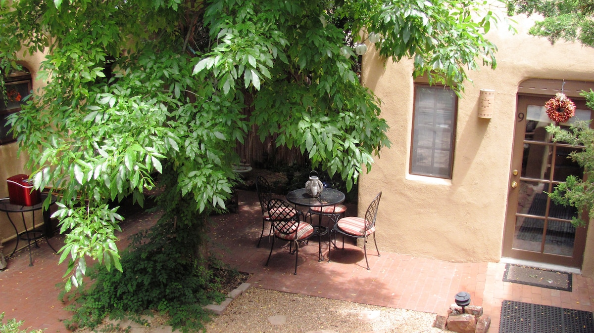 A bright cheerful ground-floor studio with king bed, south of the courtyard. Wood burning kiva fireplace, sky lit bathroom with tub/shower and natural bath amenities. » Free off-street parking. » One free museum pass (a $20 value, while supplies last). » DirecTV with premium HBO channels. » Light house keeping on stays of seven days or more. » Coffee, tea and bottled water provided.