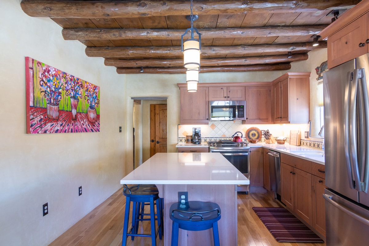 🌜H I D E A W A Y N O R T E: an inspiring & cozy adobe for your high desert adventure 🌵EASY 3 MINUTE WALK to Santa Fe's best restaurants, bars, coffee shops, boutiques, movie theaters, farmers and artisan markets. 🌵Train direct from ABQ + skip the rental car 🌵King + Queen beds 🌵Fast ⚡️ WIFI 🌵Fireplace + AC/heat minisplits 🌵Bonus Sunroom w/couch and TV 🌵Private patio 🌵Full Laundry 🌵KIDS: Pack n’ Play, high chair/booster, toys, books, white noise 🌵DOGS: beds, bowls, gated patio