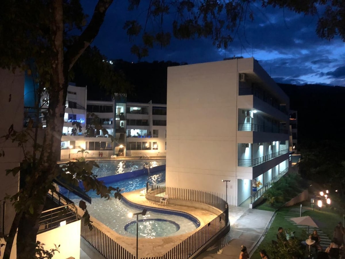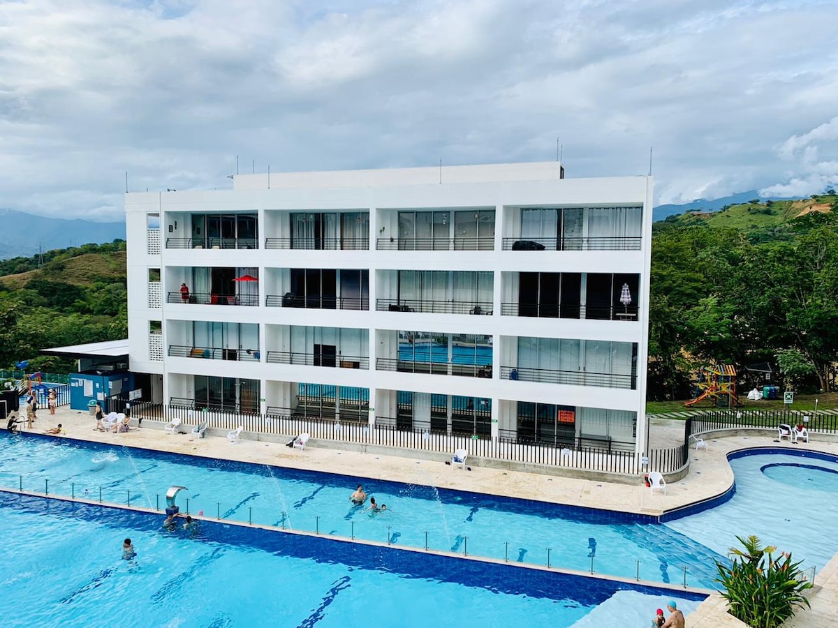 Apartasol en Citadela di Aqua, ubicado en San Jeronimo a tan solo 39 Km de Medellin; Apartamento totalmente nuevo, con vistas a la piscina y montañas, se cuenta con Tv satelital 4K, cocina totalmente equipada, aire acondicionado,etc. El citadela Di aqua te ofrece 6 piscinas tipo cascadas, 6 solarium, tobogán acuático, turco, sauna, yoga, piscinas y juegos acuáticos para niños, cancha de volleyball de playa, cancha sintética de fútbol, cancha de baloncesto, juegos infantiles etc.