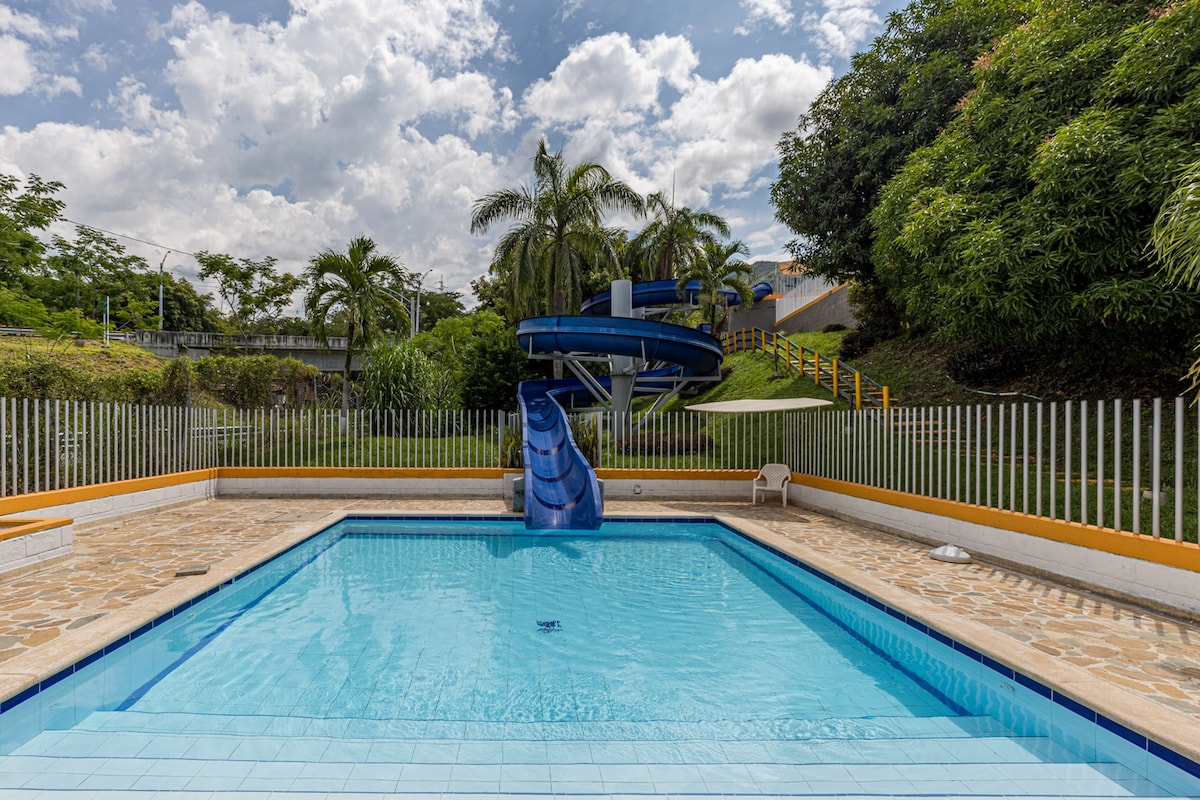 Tu familia estará cerca de todo cuando te quedes en este alojamiento céntrico. Para una estancia placentera disponemos cocina, un baño, sala con TV, terraza con hamaca, dos alcobas con aire acondicionado. Una de ellas cama doble y TV y otra con dos camarotes con 5 camas. Disfrutaras extensas zonas de piscinas, tobogán, turco, microfutbol, juegos infantiles. A dos cuadras recorrerás calles y arquitectura colonial de Santa Fe Antioquia con la tranquilidad de parqueadero privado y visitantes