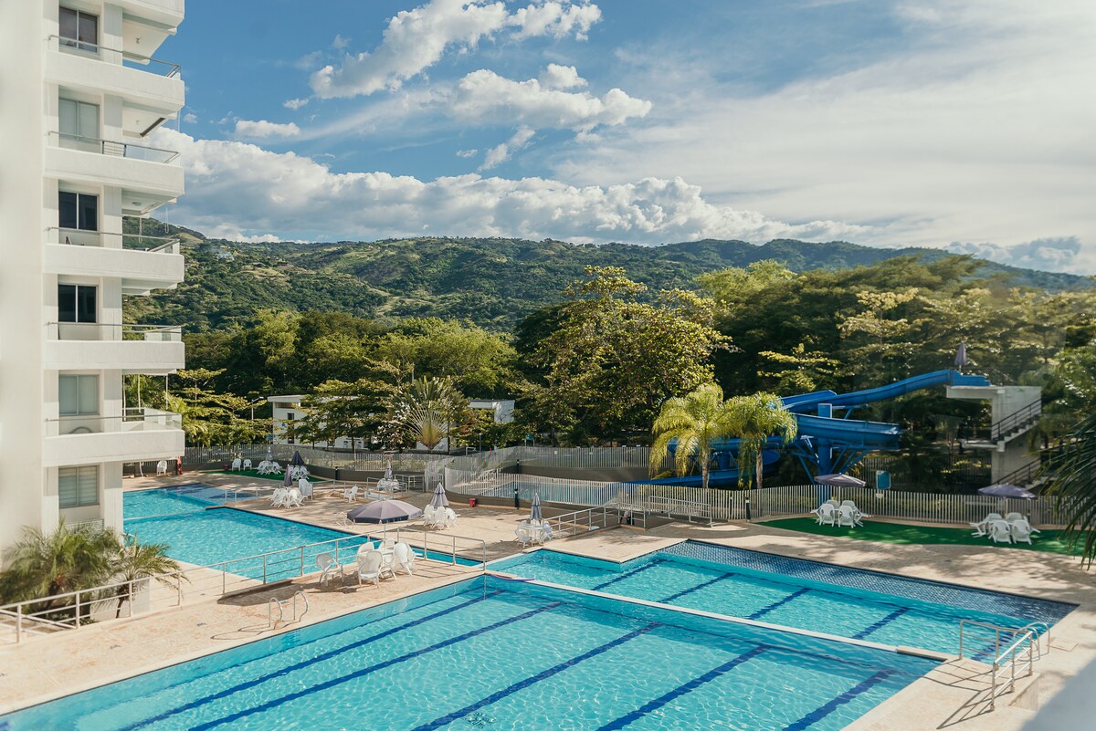 Crea recuerdos inolvidables en este alojamiento único y familiar. Nuestro apto esta ubicado a tan solo 3 cuadras del parque. Nuestro condominio cuenta con piscina para adultos y niños, tobogán, solarium, cancha de futbol, Juegos infantiles, espejos de agua y campo de golfito. Aqui viviras esperiencias inovidables con amigos, familia o en pareja ESPACIO. habitación principal zona de relajación con jacuzzi para 2 personas y tv, cama Queen. La otra habitacion cuenta con 2 camas. baño y vestier