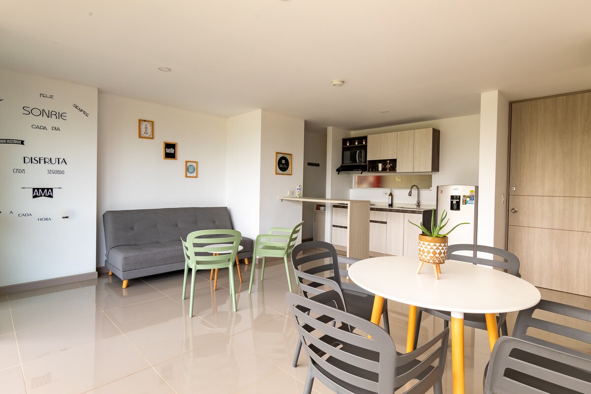 ¡Bienvenido a nuestro hermoso apartamento! dotado con comedor, barra americana, cocina con todos los utensilios, espacio de limpieza con lavadora, 1 habitación cama doble, cama auxiliar doble, y sofá cama para dos personas, 2 baños, tv en sala , parqueadero privado y vigilancia 24 horas. *Valor adicional de $45.000 a partir del tercer huésped y $50.000 por mascota.
