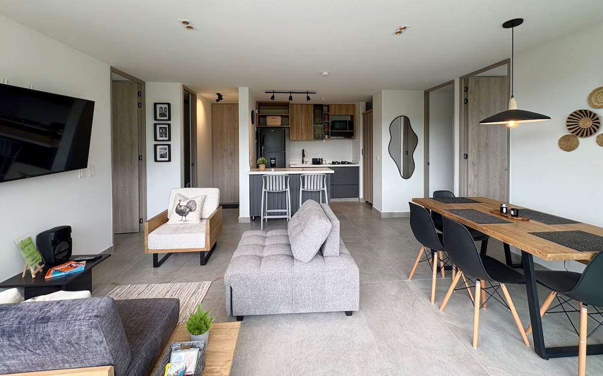 Comodidades del apartamento: - 4 camas cómodas: una tamaño Queen, 1 Camarote con 1 cama base - Aire acondicionado en la habitación principal y sala. - Sofá cama tamaño King - TV gigante en la sala - Piscina con tobogán - Parqueadero gratuito - Cocina totalmente equipada - Ascensor Ubicado a 5 minutos del histórico parque principal en Santa Fe de Antioquia, un pintoresco pueblo colonial El cual se destaca por su arquitectura colorida y calles empedradas. Un plan imperdible para familias!