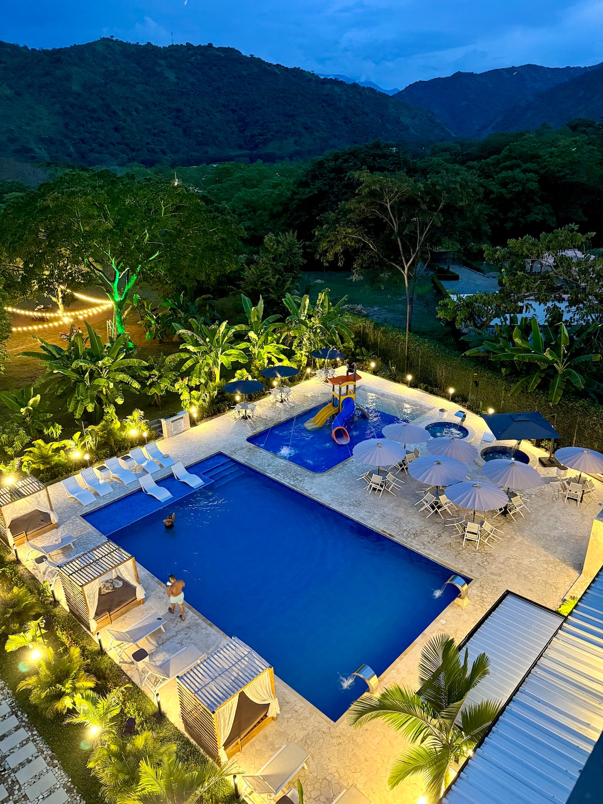 Ivanna Hotel Campestre, in Santa Fe de Antioquia, is your ideal retreat for relaxation, fun, and plenty of nature. It offers comfortable rooms, two swimming pools with hydromassage, a children's pool with a mini water park, two hot tubs, a Turkish bath, and an ecological trail with beautiful landscapes. Enjoy spacious green areas, sunbathing areas, a restaurant, bar, panoramic terrace, elevator, and private parking. A modern, family-friendly space to experience nature and comfort.
