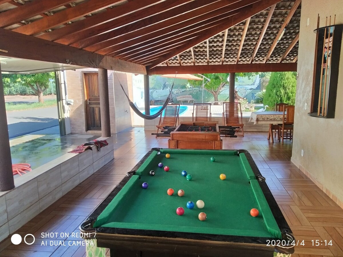 Relaxe com toda a família nesta acomodação tranquila. 3 suítes, 1 cama de casal e 1 bicama em cada suíte, dorme 4 pessoas por quarto, Total 12 pessoas. Ar condicionado de 12.000btus em cada suite. Churrasqueira Cozinha completa Mesa de bilhar Piscina aquecida