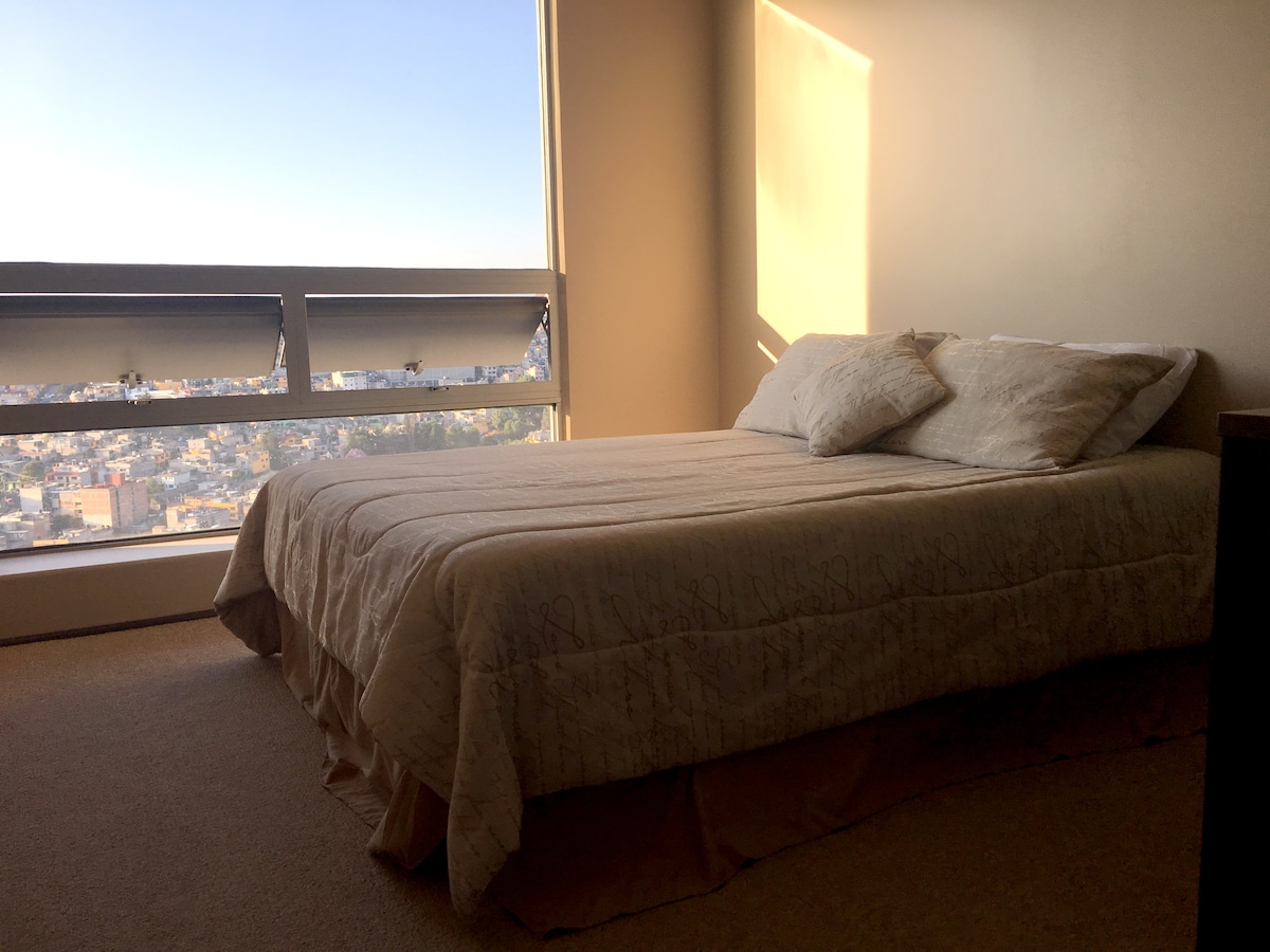 Departamento completo cama KING, baño y Wifi inalambrico. Hermosa vista hacia Santa Fe, comedor, cocina, microondas, refrigerador, lavadora, plancha. Estacionamiento techado con elevadores directos. Seguridad y vigilancia 24 horas, gimnasio Aquí te sentirás como en casa, un lugar muy acogedor con todo lo que necesitas para tu estadía. Mini super en PB, 2 restaurantes internacional y Mexicano. Junto a Santa Fe, muy cerca de Interlimas, centros comerciales, Ibero, Tec, Varias vías de acceso.