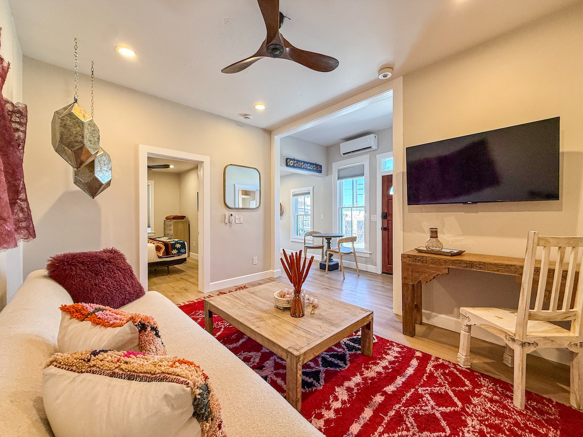 Super clean. You'll love staying in one of our cities' most interesting artist neighborhoods, where locals live. Baca St is Centrally located, just 1.8 miles from the plaza and not far from Meow Wolf & main museums. We are in a local arts area. If you want to stay on the plaza in the tourist area this is not us. We have no TV but 300 MSP WIFI. Your super clean, elegant room, full of eclectic art, has a comfy king size bed, AC, a sleeper couch, full kitchen, fridge, table & private patio.