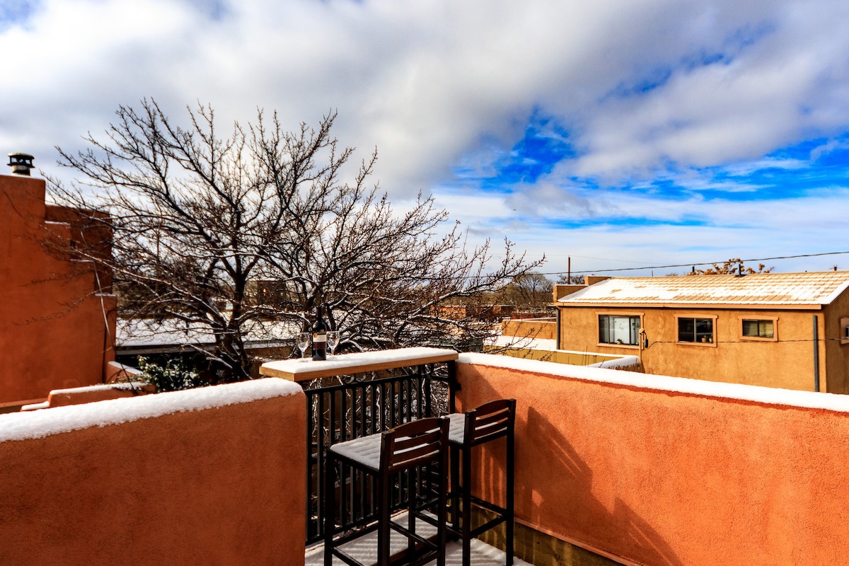 Casa de Luxx: Two Bedroom Wing is a private section of the house with its own entrance located between the Plaza & Meow Wolf. Hot tub, a sauna, and a pool open year round. Includes two comfortable bedrooms, bathroom, office, kitchenette, fire pit & patio. Peaceful with beautiful views. This wing does NOT include a full kitchen, living room, kitchen sink, or sofa. For these, book Casa de Luxx or Casita de Luxx. Tesla/EV charger.
