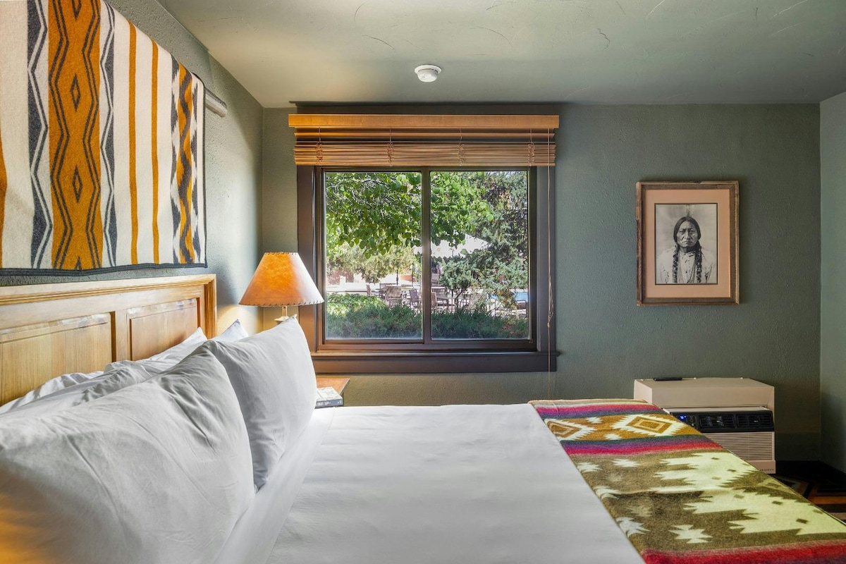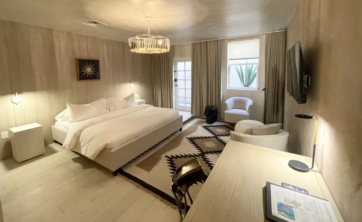 Just down Cerrillos Road in Santa Fe — that is, old Route 66 — lies El Rey Court, an iconic adobe roadside motor court originally built in 1936. Re-imagined + renovated, El Rey sits on five acres of sprawling old growth gardens and offers onsite parking, coffee/tea in the lobby, outdoor pool and hot tub (open seasonally) and airy mezcal + tequila-focused bar, La Reina. During your stay you will be placed in a room with one bed, all re-imagined with a contemporary Southwestern vibe.