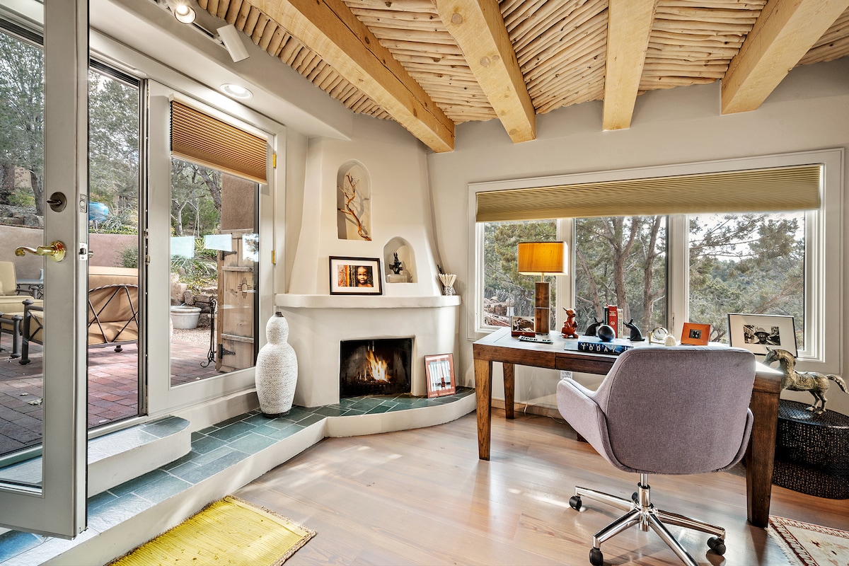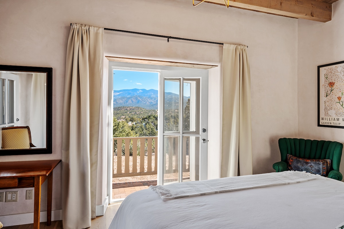 Set above the Santa Fe river, with views of Sun and Atalaya mountains, hiking trails accessible from the front door, and the shops, galleries & restaurants of Canyon Rd. just a short stroll away, "Sage Haven" emphasizes timeless simplicity & stillness. Built in 2020, the house has new strong wifi, smart televisions with AppleTV, Bosch appliances for the kitchen and laundry, a wood burning fireplace, terraces, luxurious baths, & deeply comfortable sleeping.