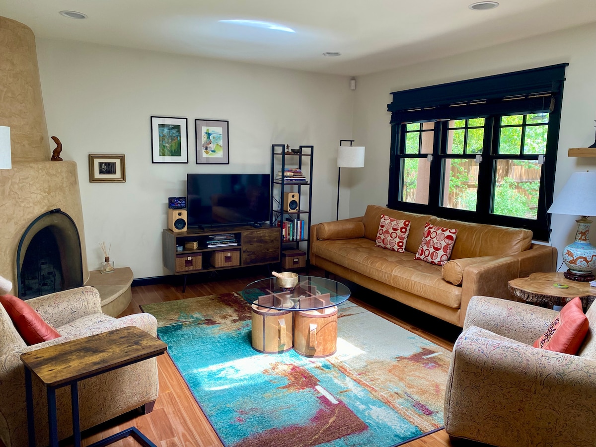 🌜H I D E A W A Y N O R T E: an inspiring & cozy adobe for your high desert adventure 🌵EASY 3 MINUTE WALK to Santa Fe's best restaurants, bars, coffee shops, boutiques, movie theaters, farmers and artisan markets. 🌵Train direct from ABQ + skip the rental car 🌵King + Queen beds 🌵Fast ⚡️ WIFI 🌵Fireplace + AC/heat minisplits 🌵Bonus Sunroom w/couch and TV 🌵Private patio 🌵Full Laundry 🌵KIDS: Pack n’ Play, high chair/booster, toys, books, white noise 🌵DOGS: beds, bowls, gated patio