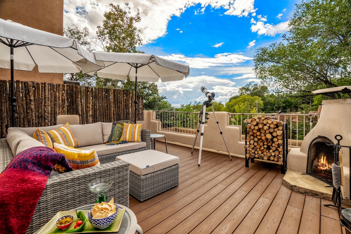 Casa de Suenos is a platform for an extraordinary experience to steep in the moment and dream. This Santa Fe gem boasts bohemian rustic furnishing, gourmet kitchen, 2 smart TV’s, turntable, and Sonos sound system. Our 5.5-acres are covered with hundreds of pinon, juniper, and cedar trees that extend to the top of the mountain behind the home. You can literally hike in your own backyard or relax on the many Portillo covered patios and contemplate clouds by day and gaze at the milky way by nigh