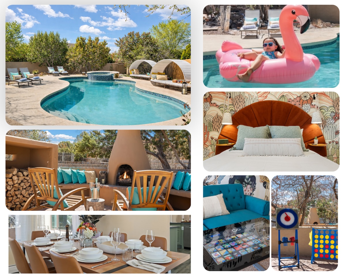 Located in the picturesque North Valley, this retreat has everything you need for a perfect getaway. It's ideal for larger groups, families, or business travelers. The spacious, beautifully updated, and stylishly furnished space offers all the desired amenities. Enjoy a gym, heated indoor pool, billiard room, wood-burning fireplaces, and more. It's just a short walk to the stunning Bosque trails and only minutes from Old Town, Downtown, and nearby attractions, museums, and dining. Permit #159088