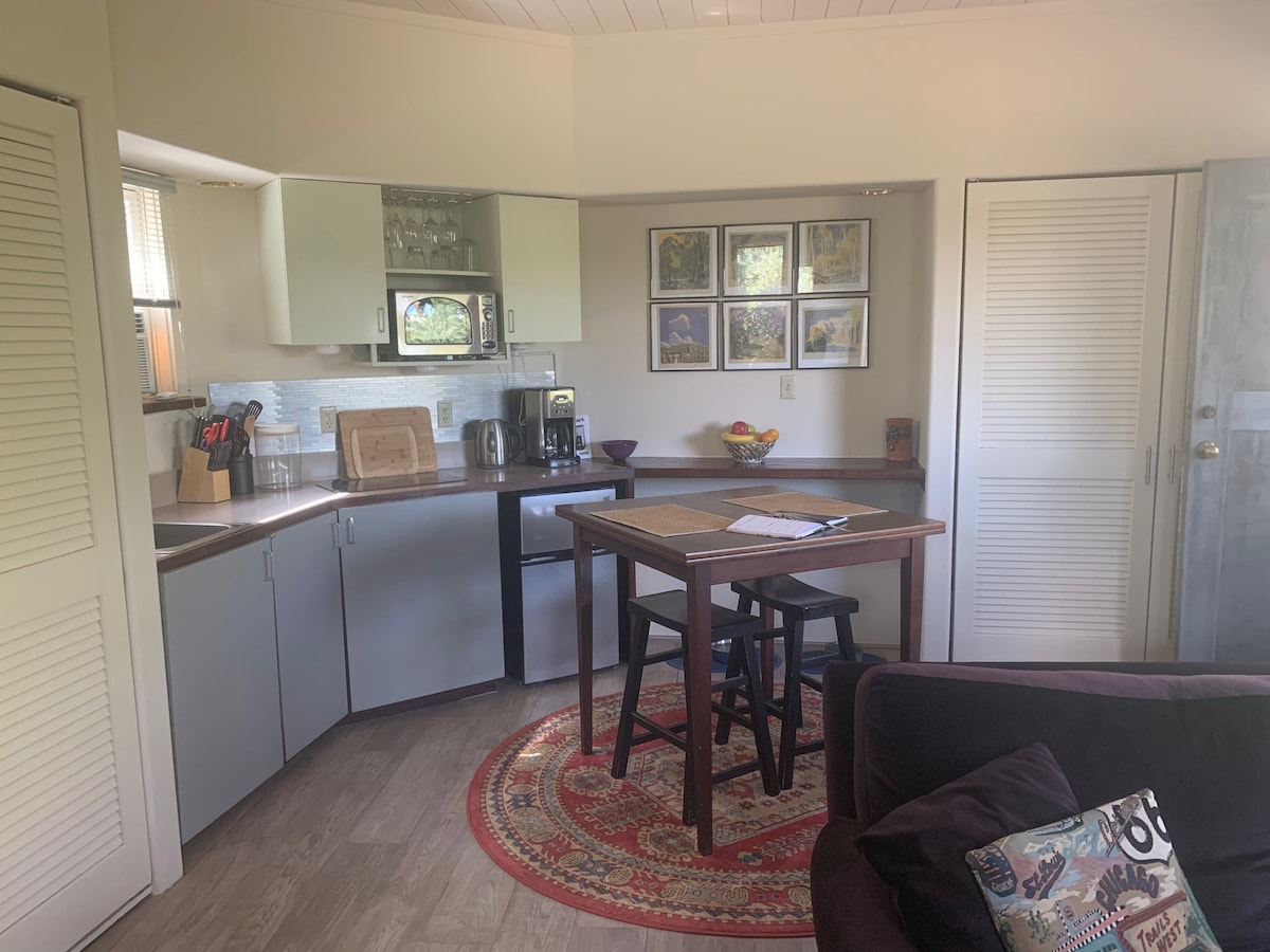 Quiet suite on the southside of Santa Fe designed for relaxation. Located in Southside near 599 & 20 minutes away from the Plaza. Main room is studio style with small living area, Queen sized bed and eating/work area. Kitchen area with everything a coffee or tea lover wants—microwave, water kettle, drip coffee maker, air fryer, and small fridge with a freezer. Walk in shower & natural light in bathroom. The suite is part of our house with a shared wall, but has its own entrance & patio.