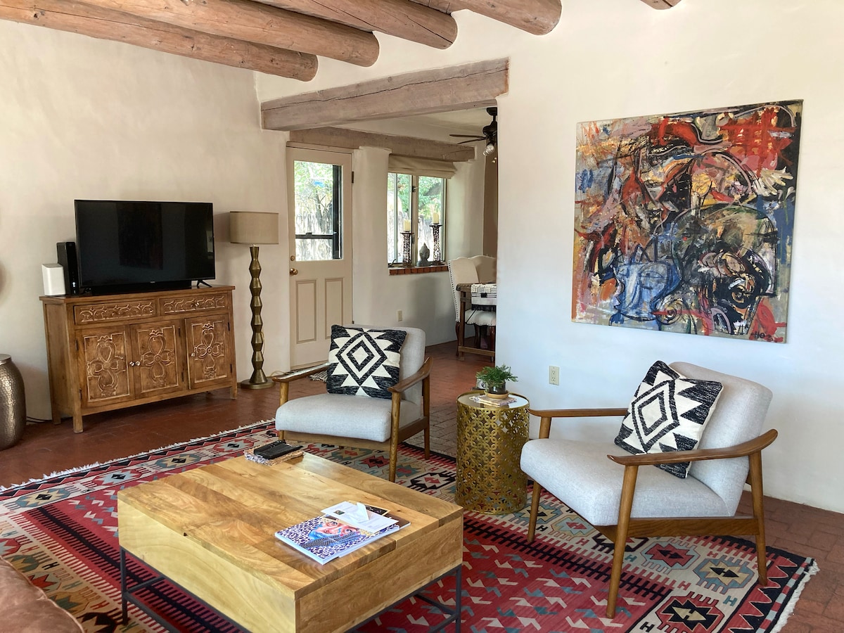 Our charming historic classic adobe casita is an easy ten minute walk to the Santa Fe Plaza, dining, and museums. We offer private off street parking for two vehicles. The interior features classic Santa Fe style wood beam Viga ceilings, kiva fireplace stocked with wood, skylights, a full kitchen living area, private bedroom, soaking tub, modern appliances, washer & dryer, swamp cooler, WIFI, flat-screen TV, a lovely enclosed courtyard with mature trees and BBQ. Dogs are welcome.