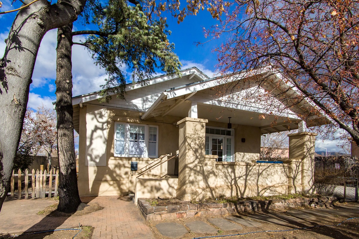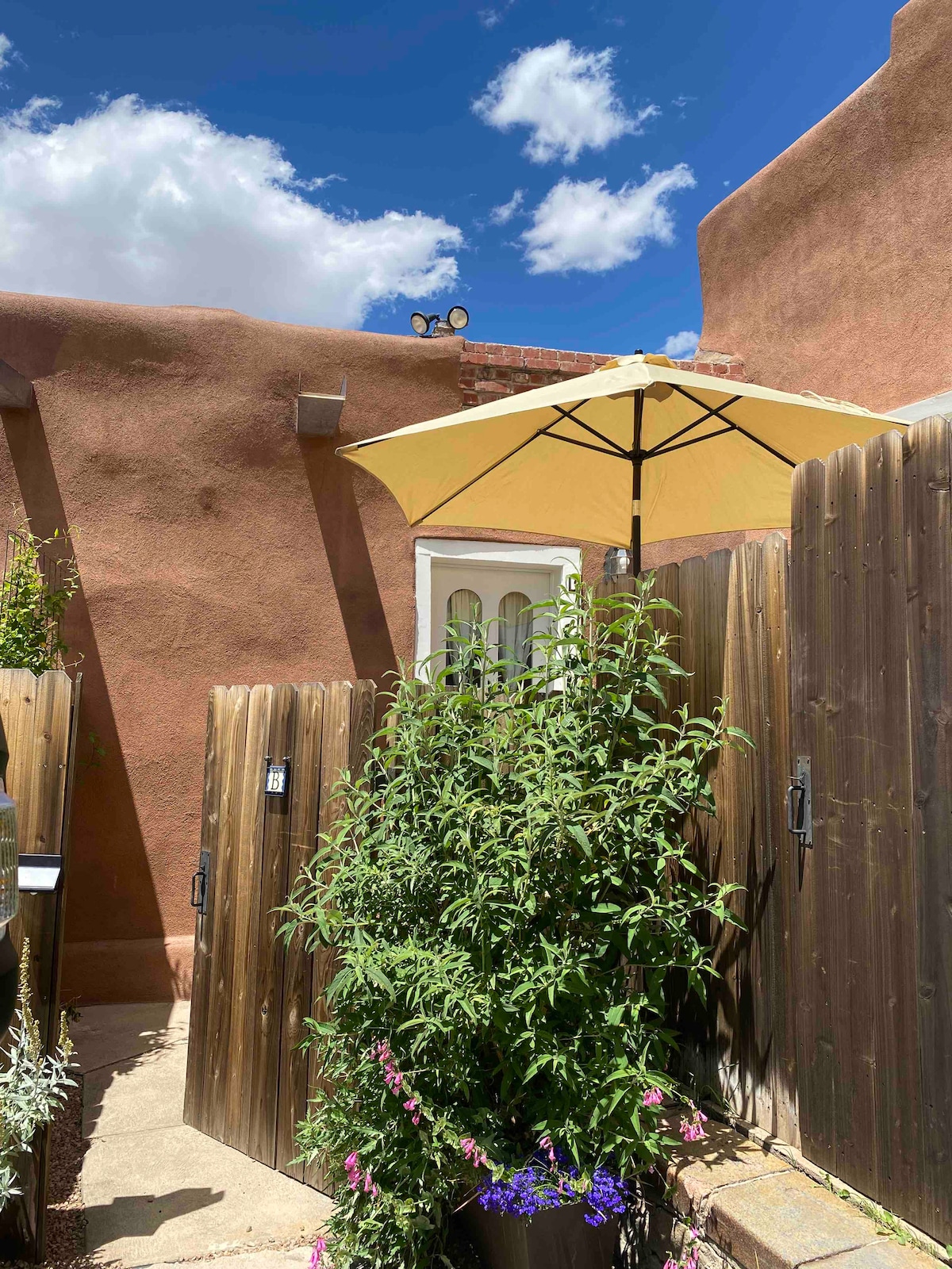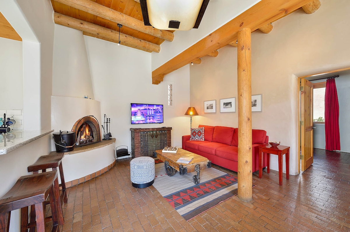 Our charming historic classic adobe casita is an easy ten minute walk to the Santa Fe Plaza, dining, and museums. We offer private off street parking for two vehicles. The interior features classic Santa Fe style wood beam Viga ceilings, kiva fireplace stocked with wood, skylights, a full kitchen living area, private bedroom, soaking tub, modern appliances, washer & dryer, swamp cooler, WIFI, flat-screen TV, a lovely enclosed courtyard with mature trees and BBQ. Dogs are welcome.