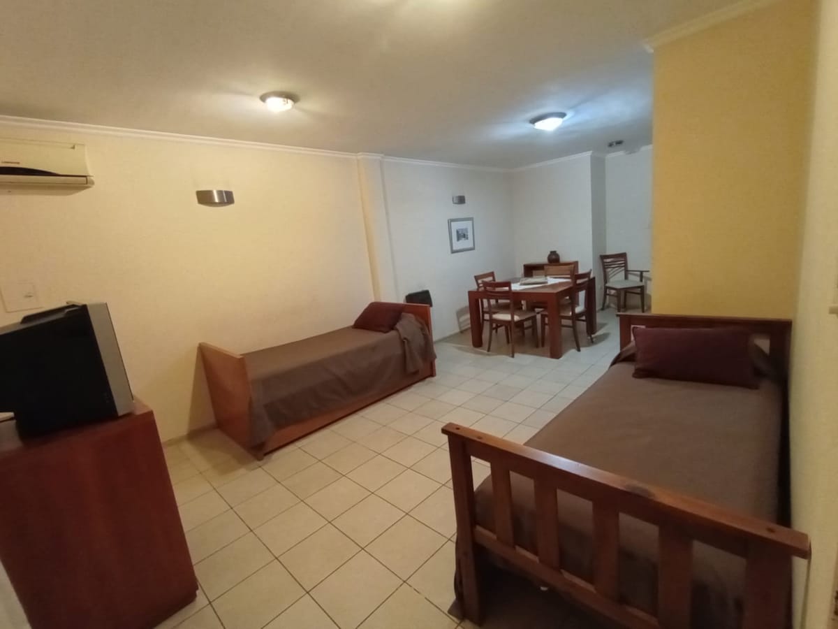 Estudio tipo monoambiente con patio. Cuenta con 3 camas individuales. Kitchen completa con anafe eléctrico. Espacio de guardado. Incluye desayuno!