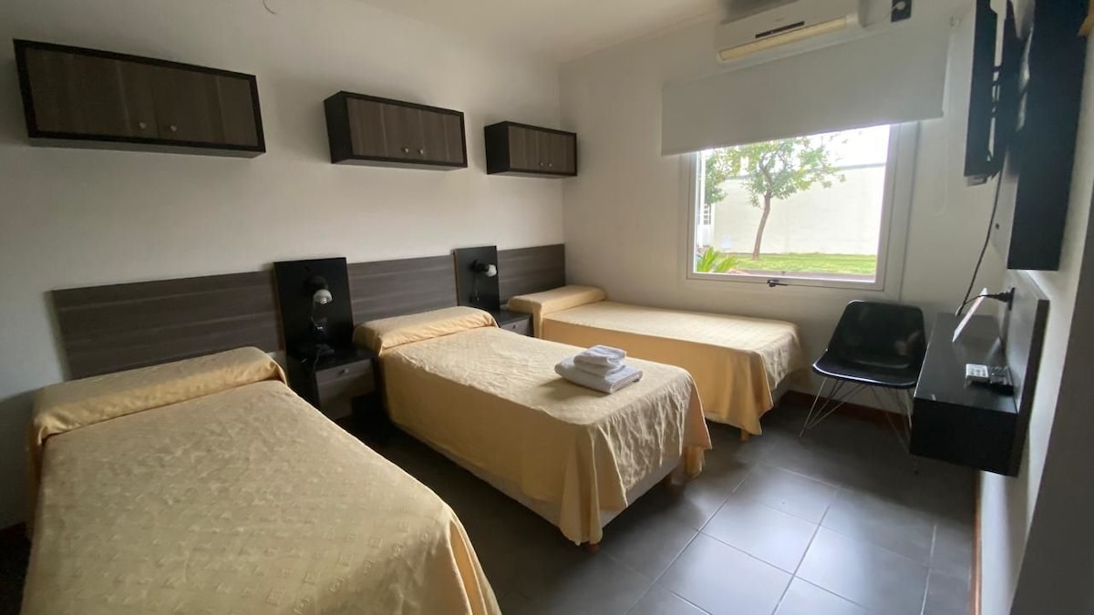 Bienvenido a nuestro acogedor apart hotel en el corazón de Paraná! Ubicado a solo cuatro cuadras de la plaza principal, te ofrecemos una experiencia cómoda y conveniente. Disfruta de una habitación con cama matrimonial, dos camas simples con marinera, y una kitchenette equipada con microondas, heladera, mesa, sillas y vajilla. Ideal para familias y amigos, nuestro espacio cuenta con WiFi gratuito, aire acondicionado y calefacción.
