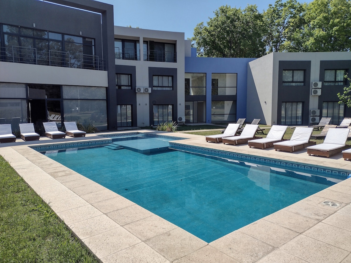 Exclusivo monoambiente en Puerto Norte, el barrio más moderno de Rosario, ideal para disfrutar el verano en la ciudad. Diseñado con un estilo elegante y funcional, cuenta con balcón con vistas únicas al río y la ciudad, cocina equipada, baño de categoría y cochera privada. La estrella del alojamiento es la piscina en la terraza, perfecta para refrescarte después de recorrer Rosario, su costanera, bares y propuestas culturales. Además, el complejo ofrece solárium, gimnasio y seguridad 24/7.
