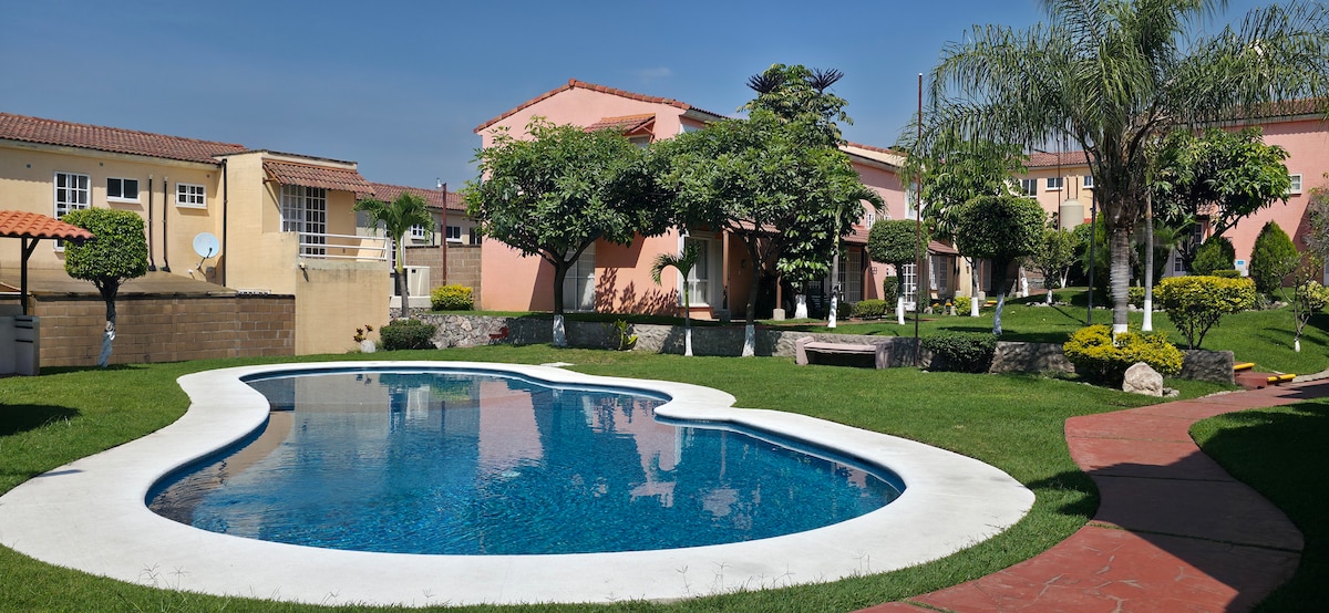 A 20 minutos del centro de Cuernavaca, totalmente equipada y muy confortable, cuenta con 2 habitaciones con Aire Acondicionado c/u, 2 baños completos y 1/2 baño en PB, terraza, comedor, cocina y patio de servicio, que harán de tus días una estancia cómoda y agradable. La privada cuenta con una piscina con chapoteadero (para los más pequeños), juegos infantiles y una palapa donde puedes pasar un día tranquilo con tu familia y/o amigos. ¡Bienvenido!