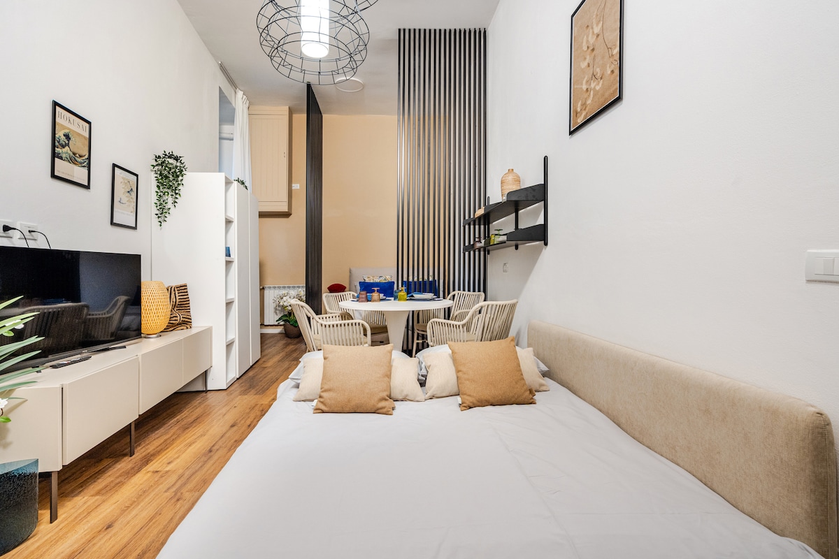 Nuovo appartamento di design situato al settimo piano con vista panoramica. Garantisce tutti i comfort necessari per un soggiorno da favola. Parcheggio privato coperto gratuito. Luminoso soggiorno con grande cucina (forno, microonde), divano letto, Smart TV 43'' (Netflix), cabina armadio, lavatrice, grande balcone perfetto per consumare un pasto all'aperto. Internet super veloce. Arredi ricercati vintage e opere d'arte.