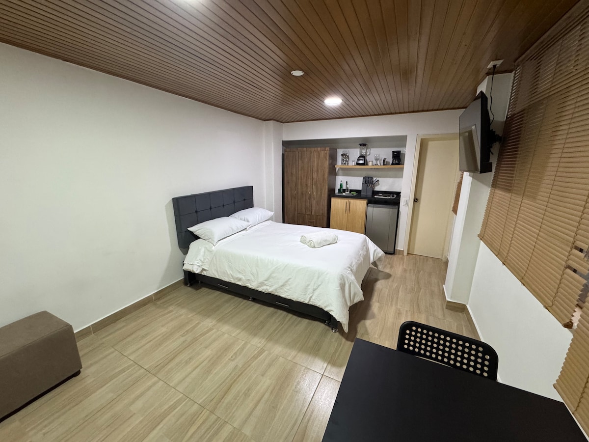Moderno y exclusivo apartaestudio en el corazón de Bogotá, con un amplio balcón, vista libre de un piso 10. Ubicado en el sector de la Candelaria, decoración moderna, cama king, cocina equipada, baño privado, e internet Wifi de 350 Mg. Está cerca de las principales entidades gubernamentales y lugares turísticos, restaurantes y sitios de entretenimiento nocturno. Perfecto para asistir a eventos y conciertos en el Movistar Arena y Estadio Campín (15 min)