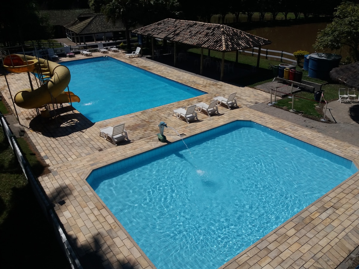 Um recanto apaixonante perfeito para encontros com a familia e amigos, ampla área verde, piscina adulto e infantil, bar molhado playground, churrasqueira, dois salões de festa ideal para seu evento, 4 chalés equipados com utensílios de cozinha, frigobar e cooktop, deck na árvore para relaxar e bater um bom papo, facil acesso com wi-fi e ótima estrutura.