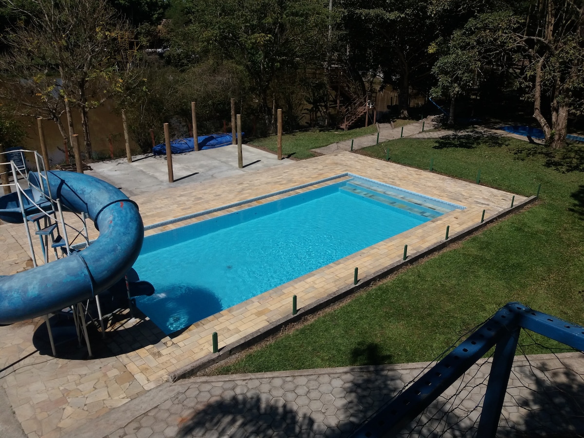 Um recanto apaixonante perfeito para encontros com a familia e amigos, ampla área verde, piscina adulto e infantil, bar molhado playground, churrasqueira, dois salões de festa ideal para seu evento, 4 chalés equipados com utensílios de cozinha, frigobar e cooktop, deck na árvore para relaxar e bater um bom papo, facil acesso com wi-fi e ótima estrutura.