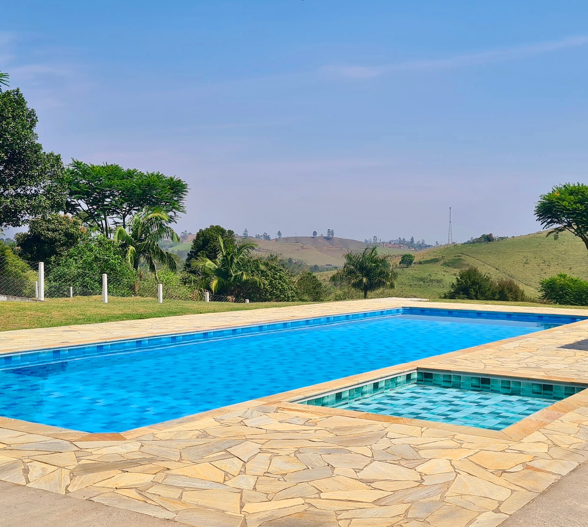 Chácara com vista panorâmica cinematográfica. Foi toda reformada e está toda completa, com Wi-Fi e todos os canais liberados, bem como churrasqueira, piscina e ventiladores em todos os cômodos. Varanda bem ampla com gramado impecável no território do imóvel. Perfeito para famílias com crianças que desejam relaxar diante de uma vista linda e panorâmica. Temos caseiros na chácara que realizam as manutenções do gramado e piscina diariamente para que tudo fique maravilhoso sempre !