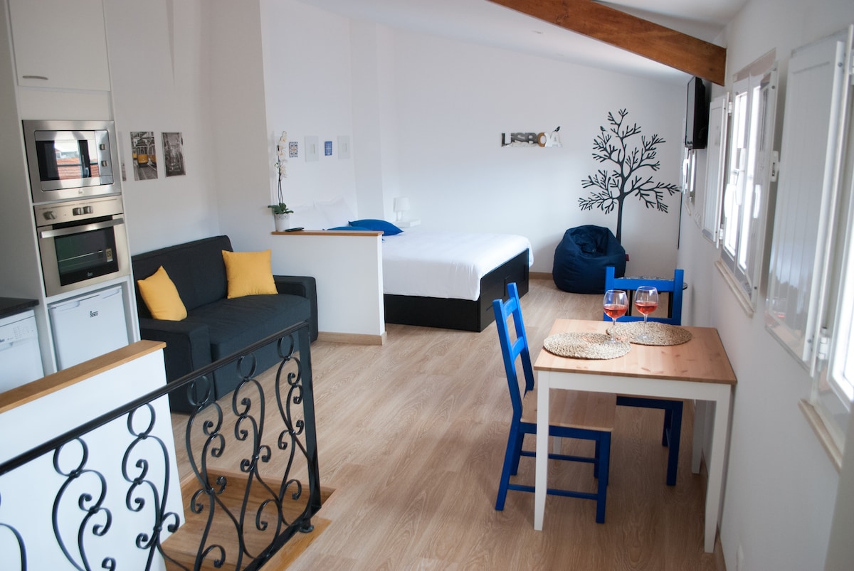 Welcome to our beautiful prestige flat, perfectly located in the heart of Lisbon city center! In a quiet oasis in one of the city's most famous historical neighbourhoods – Bairro Alto – close to Príncipe Real, Cais do Sodré and Santa Catarina - you'll feel at home in this spacious and bright studio with modern design and an exclusive garden/terrace for relaxing, eating out and enjoying the sun. Perfect for business travellers, couples & families. Fast Wifi + Workspace. Ideal for remote work.