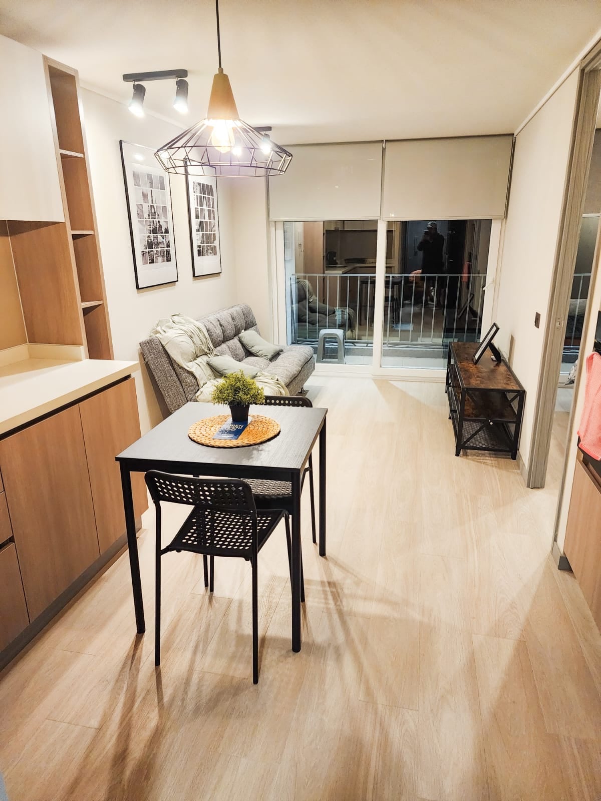 Es un departamento pequeño pero acogedor, con un living comedor conectados al dormitorio. La cocina está a parte y con todos los utensilios necesario para cocinar. El baño tiene un lindo diseño y es muy cómodo de usar. En el living comedor se encuentra el televisor, el cual se puede ver desde el dormitorio. Para el invierno el aireacondicionado funciona como calefacrtor que tira airecaliente.