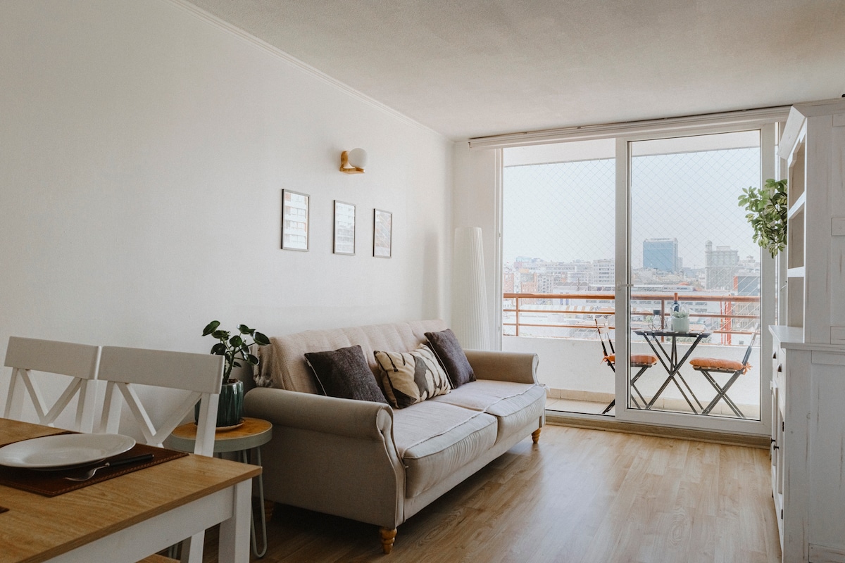This apartment is ideal for relaxing and enjoying the city. It's centrally located, between the Santiago Centro and Providencia districts, one of the best locations in the city. It offers beautiful views of San Cristóbal Hill and the Sky Costanera. It's just a 3-minute walk from the metro and buses. Includes: Free Wi-Fi, a fully equipped kitchen, sheets and towels included, a large bed with a large Smart TV. Self-service entrance with a key, allowing you to arrive at any time.