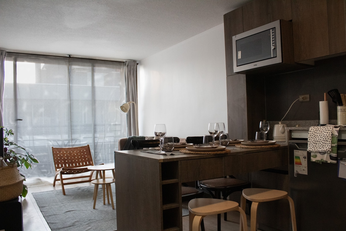 Furnished apartment with excellent location near supermarkets , just 1 block from the Santa Lucia Metro and 20 minutes walk from downtown Santiago, excellent connectivity and access. With separate room, bathroom en suite, two Smart TV, kitchen, oven. Work area with desk plus lamp and chair with excellent speed wifi. Terrace to smoke or enjoy the outside Air Conditioning INVERTER 12000 BTU. - supermarket just blocks away. - Café just 300 metres away. - Cerro Santa Lucia at only 800 meters.