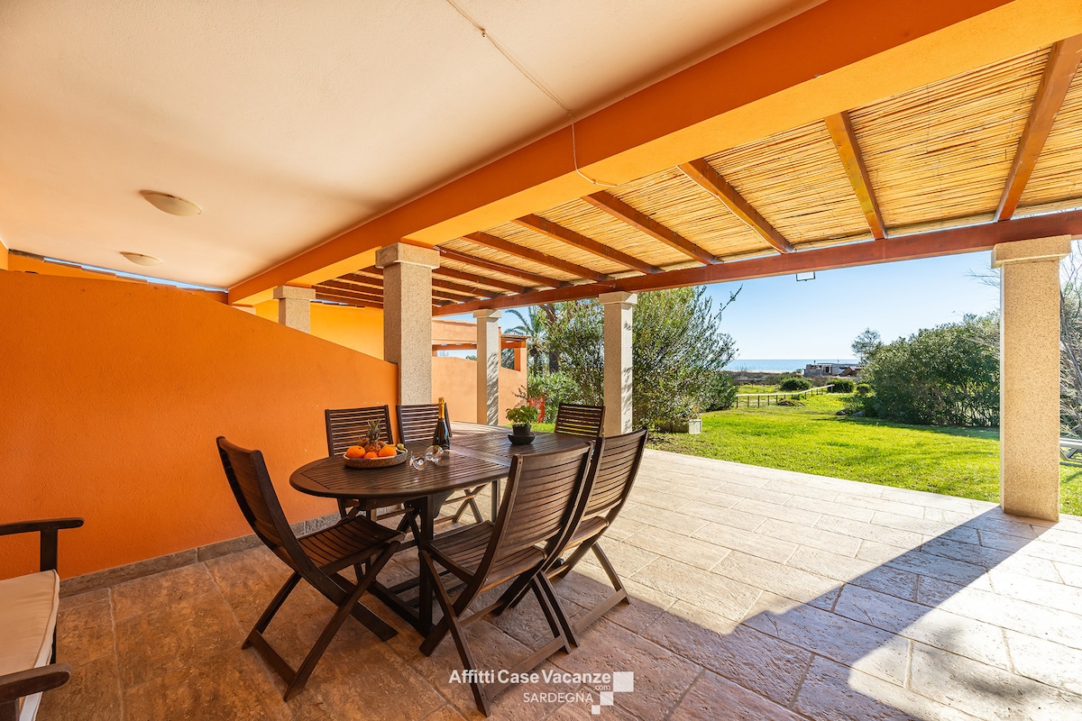 Appartamento situato in una villa, fronte spiaggia Su Giudeu, ideale per una coppia o per famiglia con bambini o ragazzi, composto da cucina con ampio soggiorno, 1 camera matrimoniale, una zona notte con due letti a castello in un punto riservato dell' ampio soggiorno e un divano letto matrimoniale, un bagno,ampia terrazza coperta fronte zona barbecue,a disposizione dei tre appartamenti che compongono la villa. L'appartamento è dotato di lavatrice, tv, zanzariere, micronde, forno, posto auto.