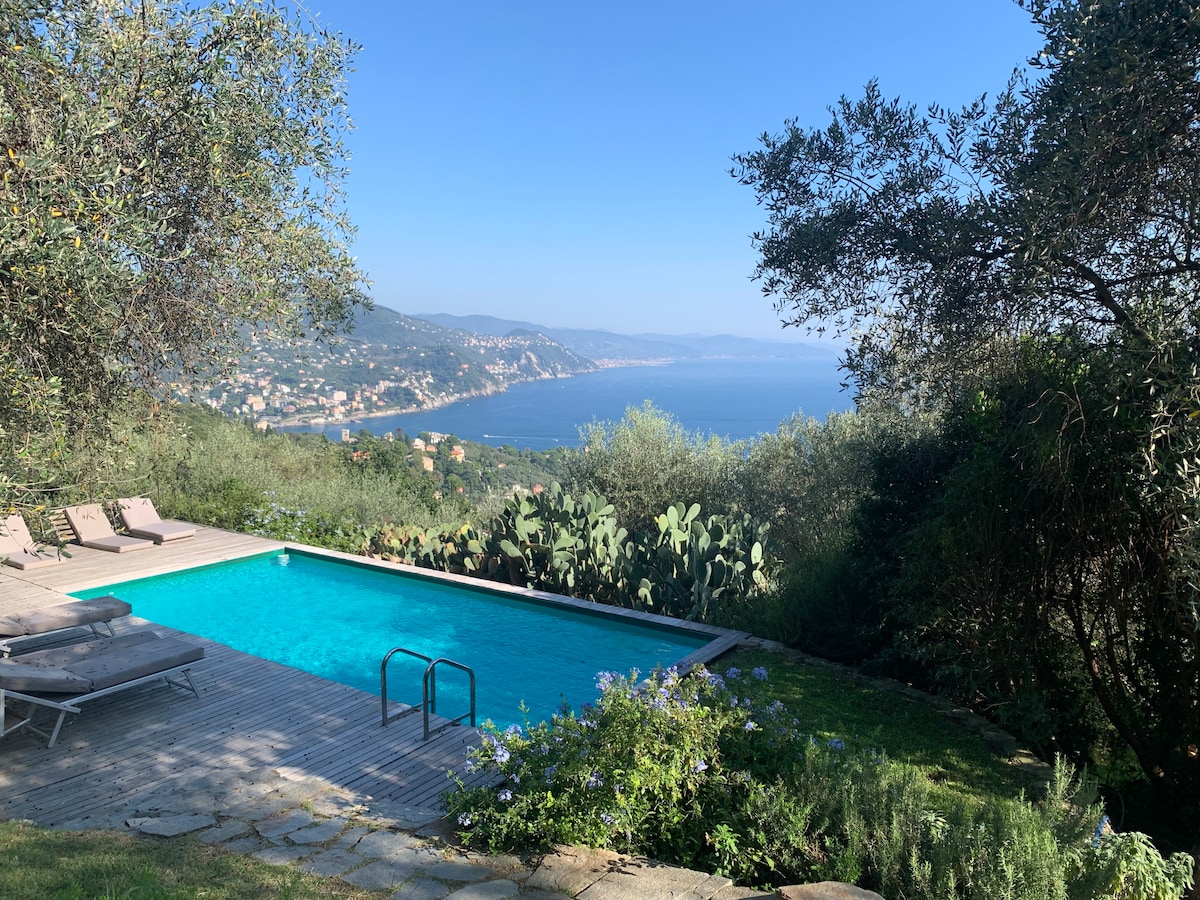 La casa è totalmente indipendente, immersa nel verde dell'uliveto ligure, con una vista mozzafiato sul Golfo Paradiso. Il panorama fruibile dalle terrazze e dalle finestre si apre dall'estremo ponente ligure al Monte di Portofino e nelle giornate limpide fino all'arcipelago toscano e la Corsica. Il mare (500 m.) Recco(1200 m.) il Parco Nazionale di Portofino(3km) sono raggiungibili oltre che in auto, anche a piedi con panoramiche passeggiate; Genova-Nervi dista 12 km (SS1 Aurelia)