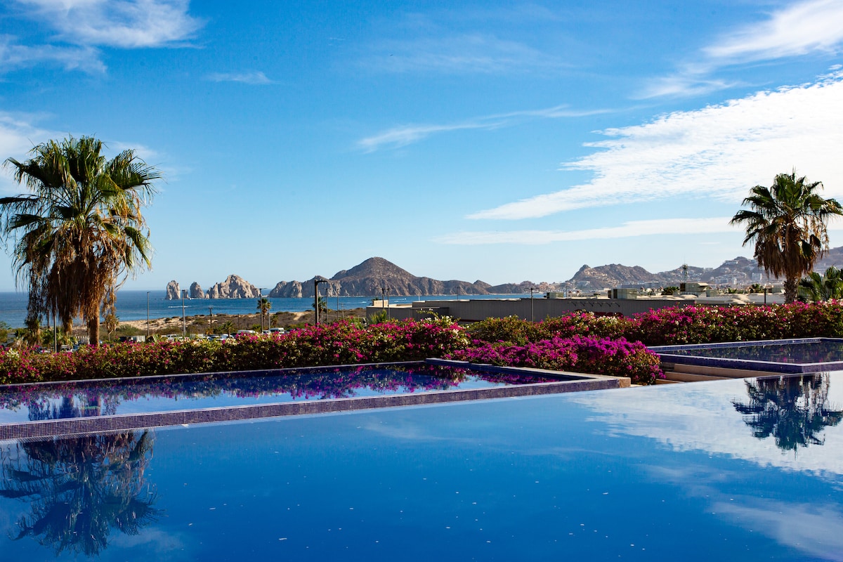 - Sweeping bay and Arch views from your private wraparound terrace: perfect for morning coffee or sunset cocktails. - Tennis courts, climate-controlled pool, and fully-equipped gym. - Two spacious bedrooms sleep 6 comfortably with a dedicated workspace, full kitchen, and in-unit washer/dryer. - Walk 5 min to Costco and Soriana for easy grocery runs or visit the marina restaurants and nightlife. - Reserve now for a serene retreat with all comforts and a welcoming host!