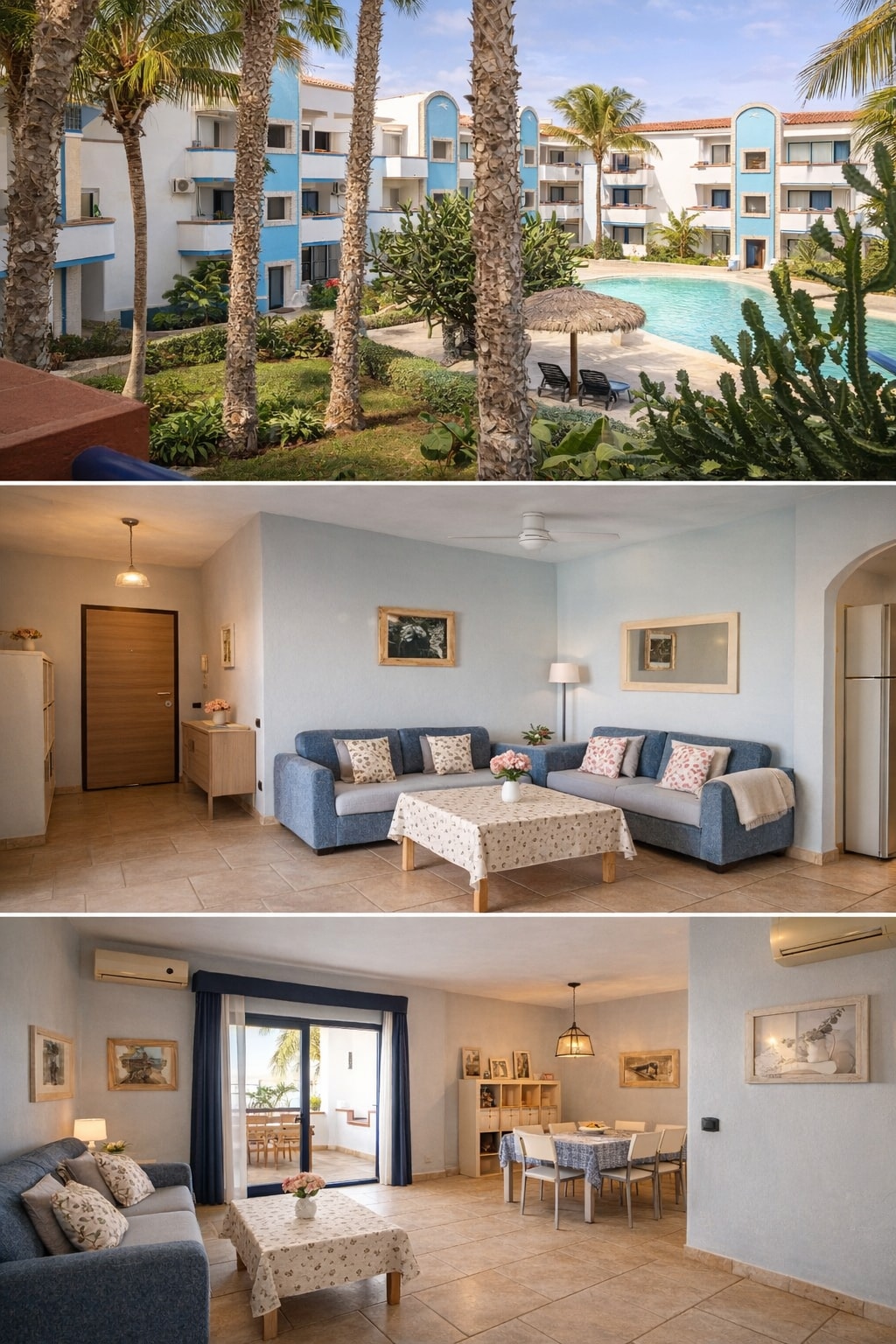 Opening the front door of your apartment and facing the turquoise water. Isn't that what we all want? If that's not enough, there is also a sharing swimming pool. Located in a private apartment complex in the center of Santa Maria, this gorgeous 2 bedroom apartment offers everything for you to feel at home. It is a 5 minute walk from the biggest supermarket in Santa Maria as well as all bars, restaurants and activities. A cleaning lady is at your disposal everyday if you'd wish.