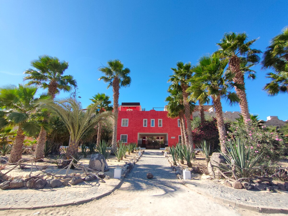 Studio with patio in the tropical garden of Porto Antigo 2, meters from the lovely pool and just steps further to the beach. The studio is well-furnished with decorative art, with its own patio overlooking the bougainvillea and palm trees. The resort is a private, welcoming haven that is literally ON the beach and a minute from the lively town centre of Santa Maria. At studio 16 you can enjoy breakfast on your sunny patio or have a siesta in the afternoon shade.