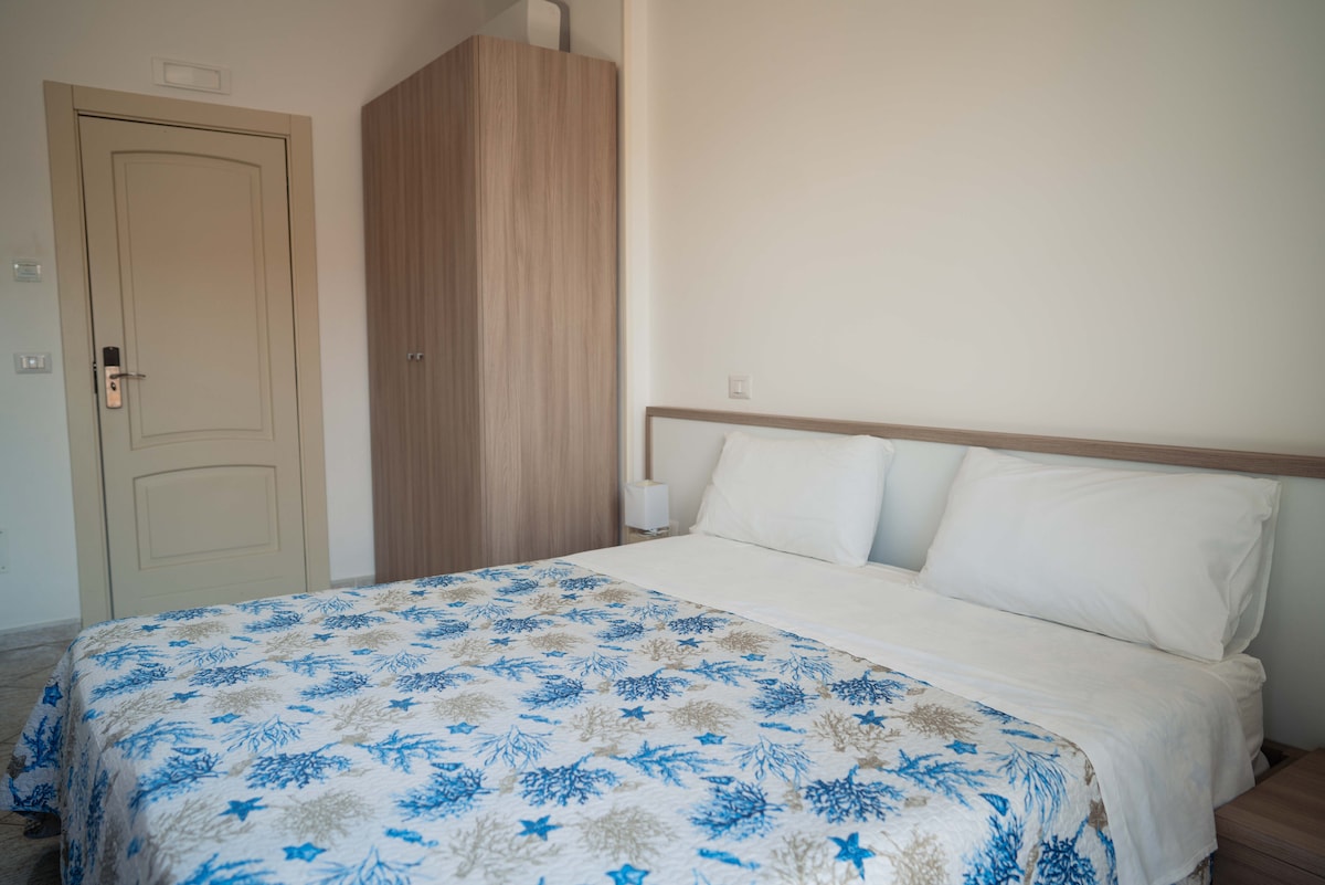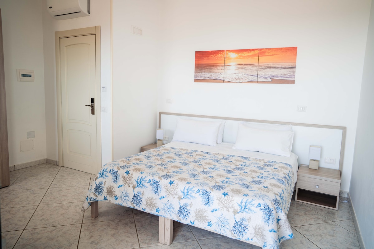 Camera matrimoniale con balcone vista mare, luminosa e confortevole, dotata di bagno privato, WiFi, TV e aria condizionata. Ogni mattina vi accoglieremo con una colazione genuina e curata, servita sulla terrazza con vista, per iniziare la giornata nel modo migliore. A pochi minuti dall’hotel, troverete le nostre splendide spiagge Bandiera Blu, caratterizzate da fondali bassi e acque cristalline.