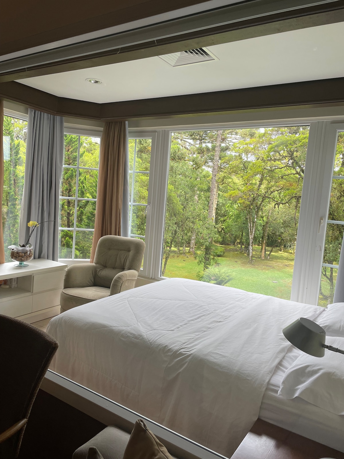 Lindo Flat/Suíte para até 05 pessoas, com quarto de casal, sala com dois ambientes com mesa para jantar, sofá cama + cama aux, lareira e cozinha completa. O banheiro possui , aquecedor de toalhas e banheira Quarto e sala possuem uma vista linda para o bosque de araucárias. Ideal para relaxar com sua família. Localizado no Cond Laje de Pedra com toda estrut ext a disposição, campo de futebol, quadras tênis e academia ao ar livre. Serviço de hotel, limpeza diária, troca roupas de cama e cozinha