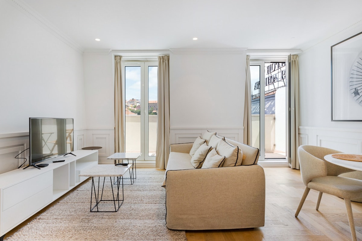 Elegant 1 bedroom apartment in one of the most exclusive locations in Lisbon. 1 bedroom with en-suite bathroom, living room with Smart TV, High Speed WIFI 1GB, Sofa bed, dining area and complete kitchen. Toilet. Terrace with sitting area with lots of light and views to Praça Restauradores and Avenida Liberdade. Nearby and withinwalking distance you will find lots of high end boutiques, shops, cafeterias, restaurants, Train Station, Parking and tourist areas such Chiado or Bairro Alto.
