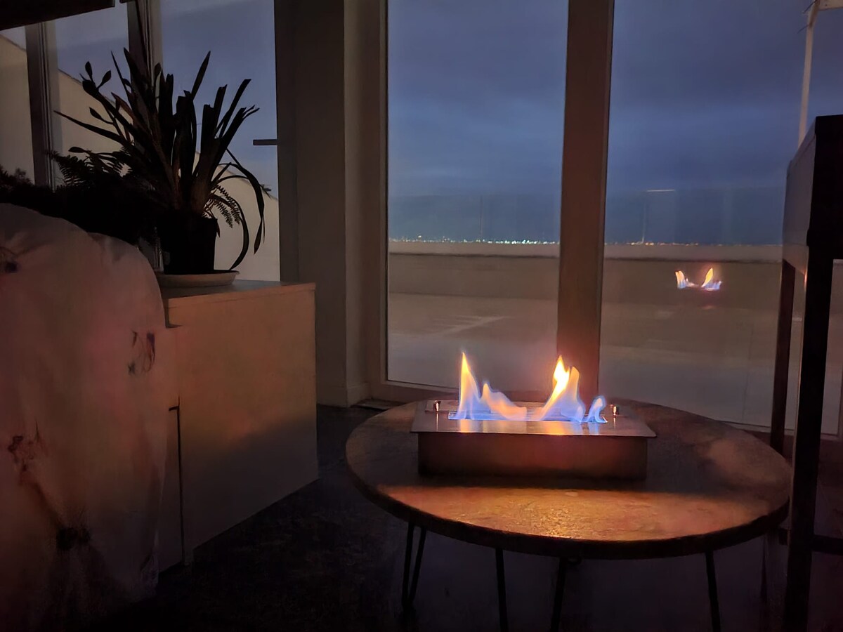 The Skysuite is a unique and private studio / loft space. The property benefits from stunning views and a private 50m2 roof terrace , complete with retractable shade. It has its own private entrance off of a communal lift servicing the top floor of an apartment building. Centrally located in Carcavelos, the Skysuite offers 180 degree views of the sea and Caparica Coast line. Furnished with a double bed and sofa , amenities include a kitchenette and dedicated cardio and workspace areas.