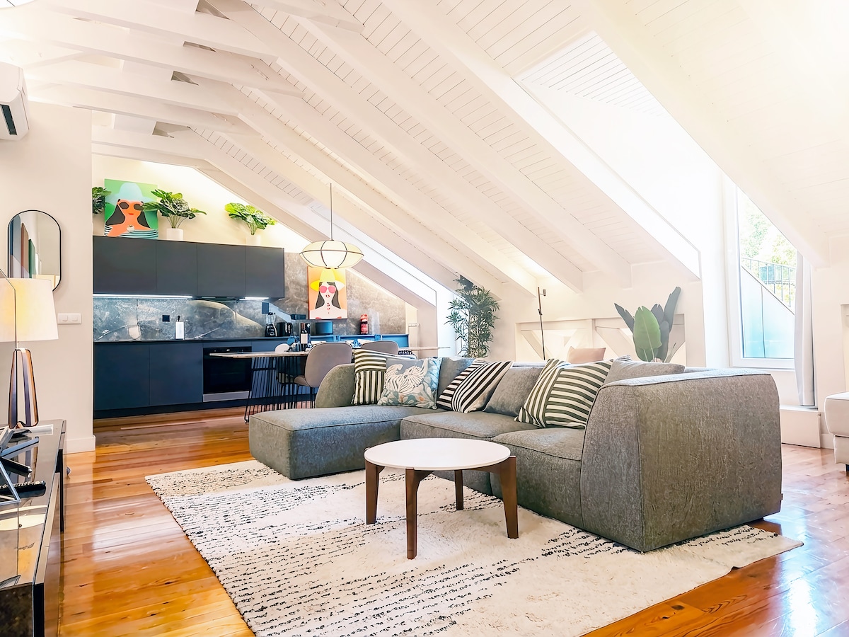 Enjoy a unique experience in this luxurious penthouse located in the Chiado district. With a breathtaking view of the city and the river, it has a loft and terrace with a 180 degree unique view. The open kitchen is designed with high quality appliances and dining space which leads to the living room. For evening, 2 king size beds and 3 bathrooms with fitted wardrobes provide relaxation, comfort and welcome organization. The top floor loft has a bar area, tv and a comfortable sofa for quiet time.