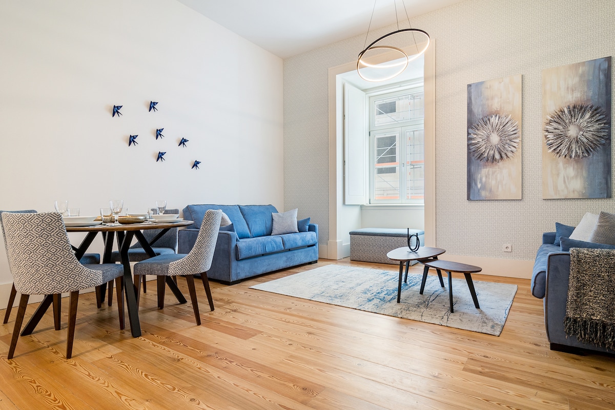 This trendy and stylish apartment is located in Baixa, Lisbon downtown, in a very central location and very close to Chiado. The decoration is upscale with beautiful paintings in the living room and comfortable setting throughout the entire flat with A/C. Recently refurbished, the building maintains the traditional character of Baixa, yet modern inside with two elevators. Just walk out from the building into the heart of Baixa where you can dine, shop and enjoy the best Lisbon has to offer!