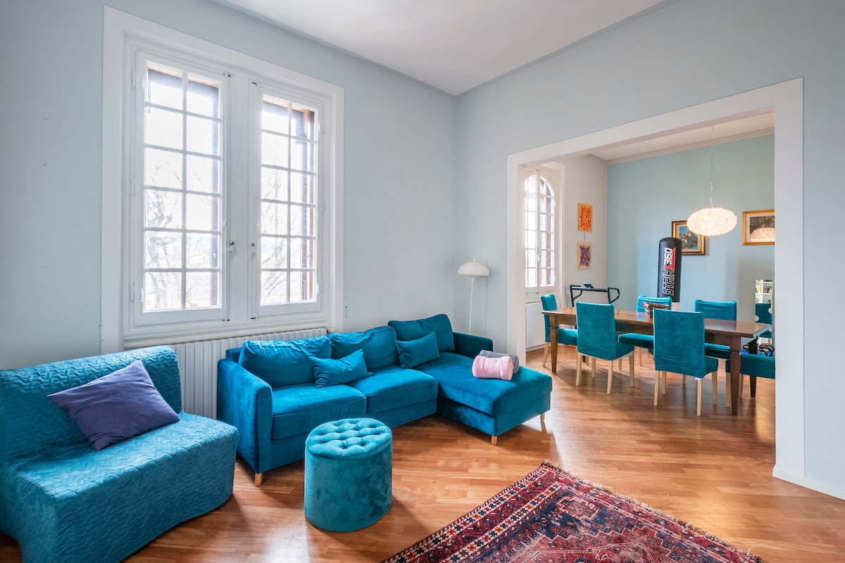 This is a refined double-volume apartment, ideal for a couple, but also for a family with 1-2 children. On the lower floor, there is the kitchen and the living room with a sofa (which can turn into a comfortable double bed), and on the upper floor, the double bed with a bathroom divided into 3 zones, making it unique. The room is characterised by shades of blue, and in respect of its historicity, the original stuccos on the ancient cross-vaulted ceilings have been preserved.