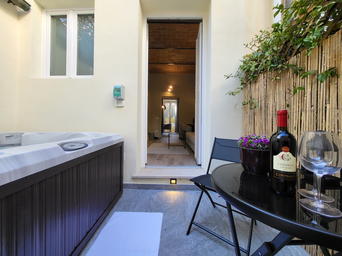 Elegante e spazioso appartamento con piscina Jacuzzi nel centro storico della cittá in una posizione unica e perfetta vicino a tutto. L'appartamento è nuovo e accessoriato con riscaldamento e aria condizionata. Un esclusivo spazio esterno dove vi potete rilassare nell'acqua calda della piscina jacuzzi e dove é possibile mangiare all'aperto. Ambiente molto tranquillo e silenzioso , la strada è pedonale senza traffico di automobili. il parcheggio si trova vicino a 200 metri.