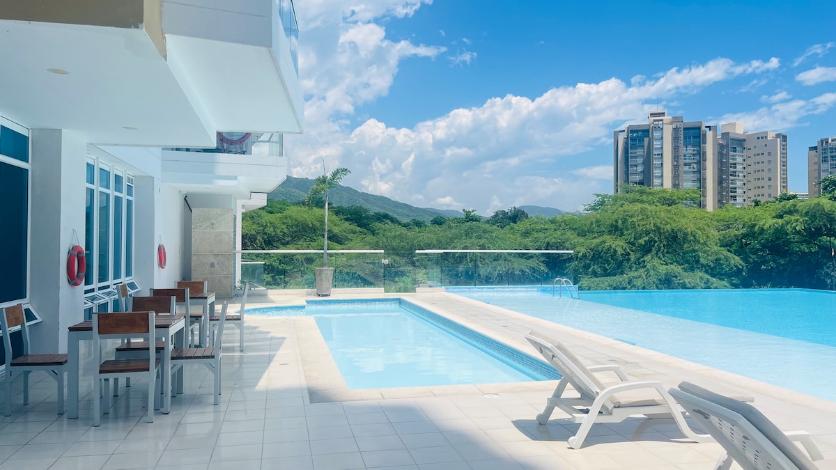 Vive el Caribe en un edificio único del Centro Histórico de Santa Marta, a una cuadra del mar y rodeado de la mejor oferta cultural y gastronómica. Disfruta piscinas en rooftop con vistas 360° al mar y la Sierra y piscina de sombra en el primer piso. Diseño que combina modernidad y encanto histórico. El apartamento ofrece 2 habitaciones climatizadas, sala con sofá cama, cocina equipada, balcones privados y WiFi. Todo pensado para una experiencia auténtica y cómoda.