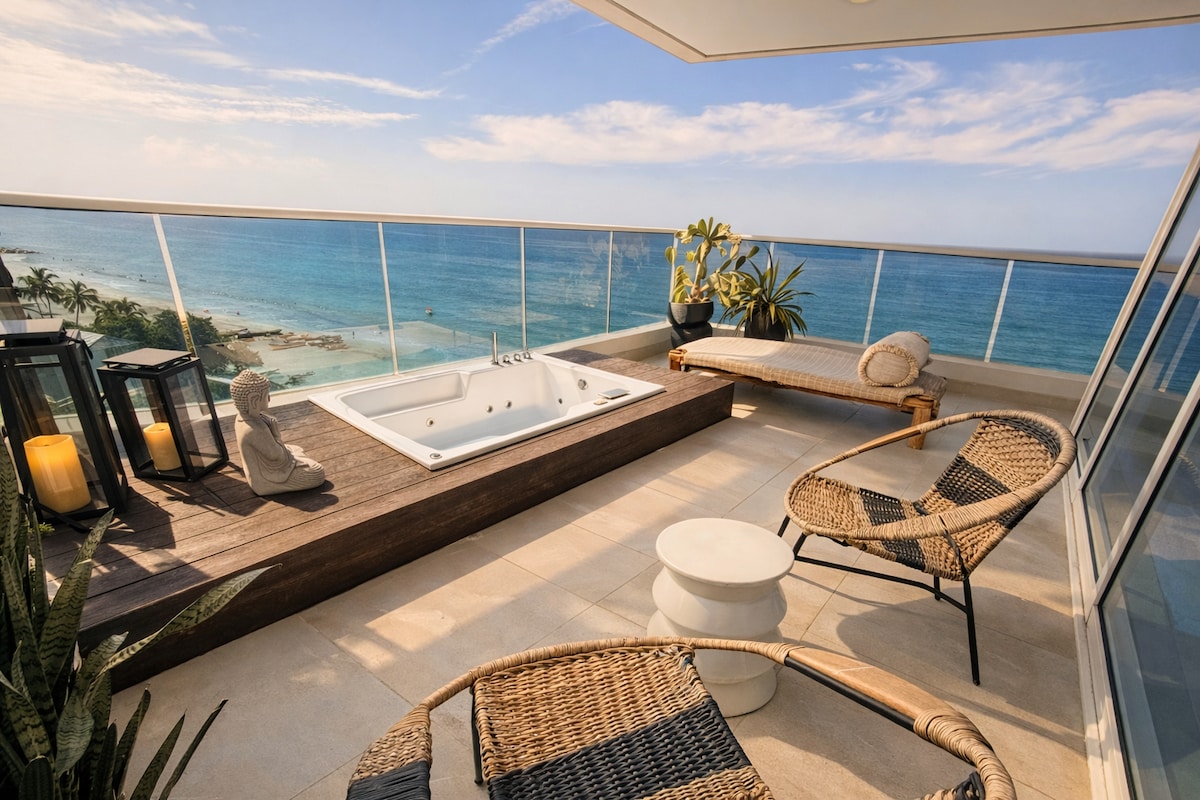 🌊 Beachfront Luxury Retreat with Private Jacuzzi & Panoramic Ocean Views ⭐ Rated 4.9+ by 70+ guests for cleanliness, comfort, and unbeatable location. ✔️ Direct beachfront location ✔️ Private jacuzzi with ocean views ✔️ Spacious balcony for sunsets & dining ✔️ 3 bedrooms / 3 bathrooms (perfect for groups) ✔️ Fast, reliable Wi-Fi — ideal for remote work or streaming ✔️ High-end finishes & floor-to-ceiling windows ✔️ Free parking & 24/7 security